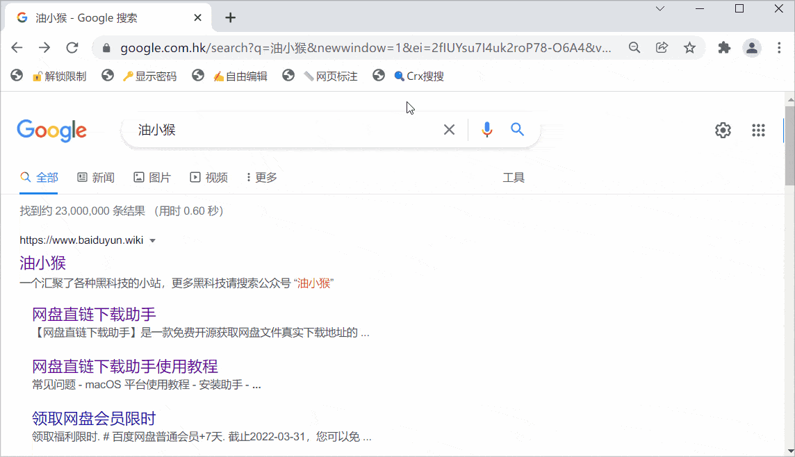 拖动图标添加到书签栏,点击 Crx搜搜 书签后,您可以在任意网页搜索扩展。